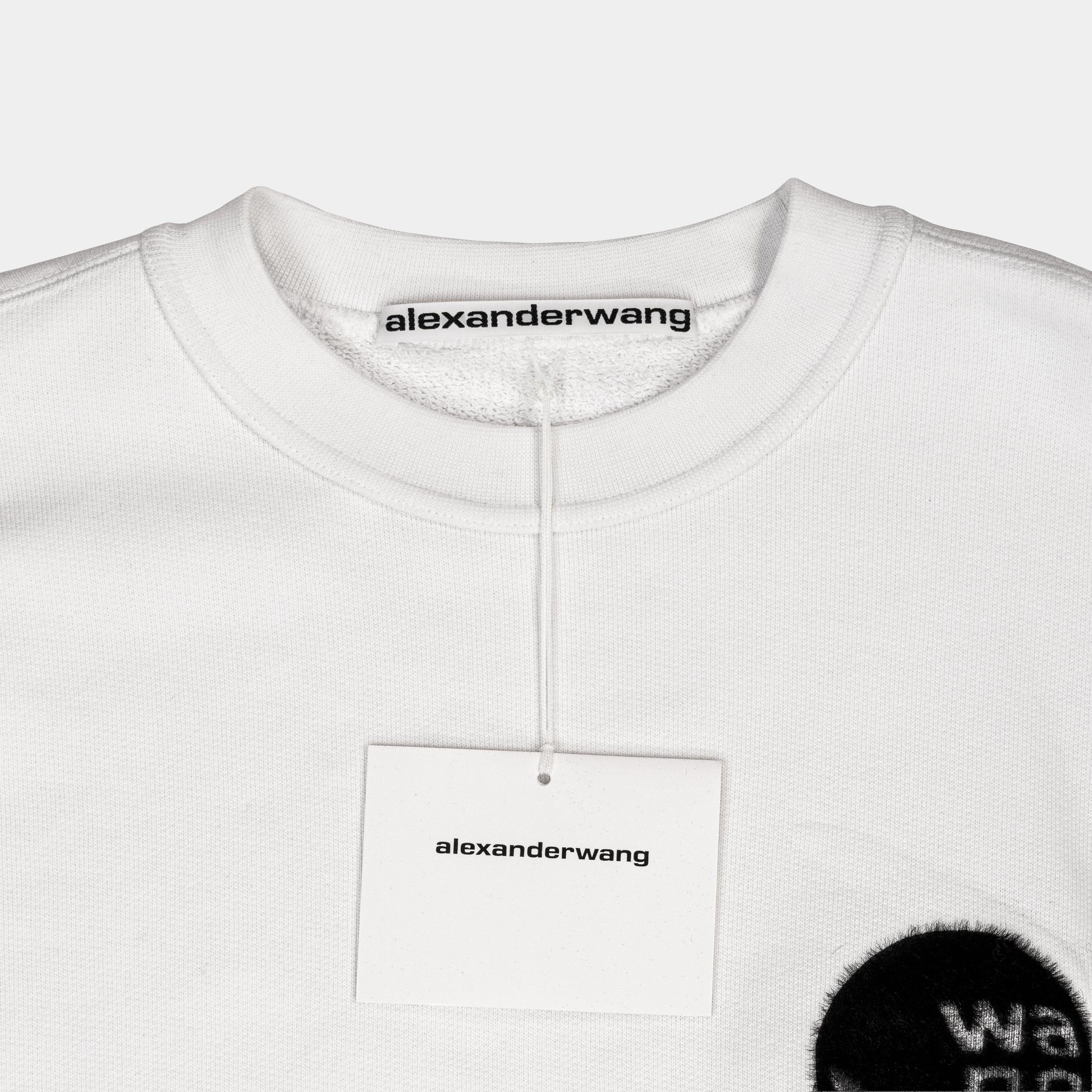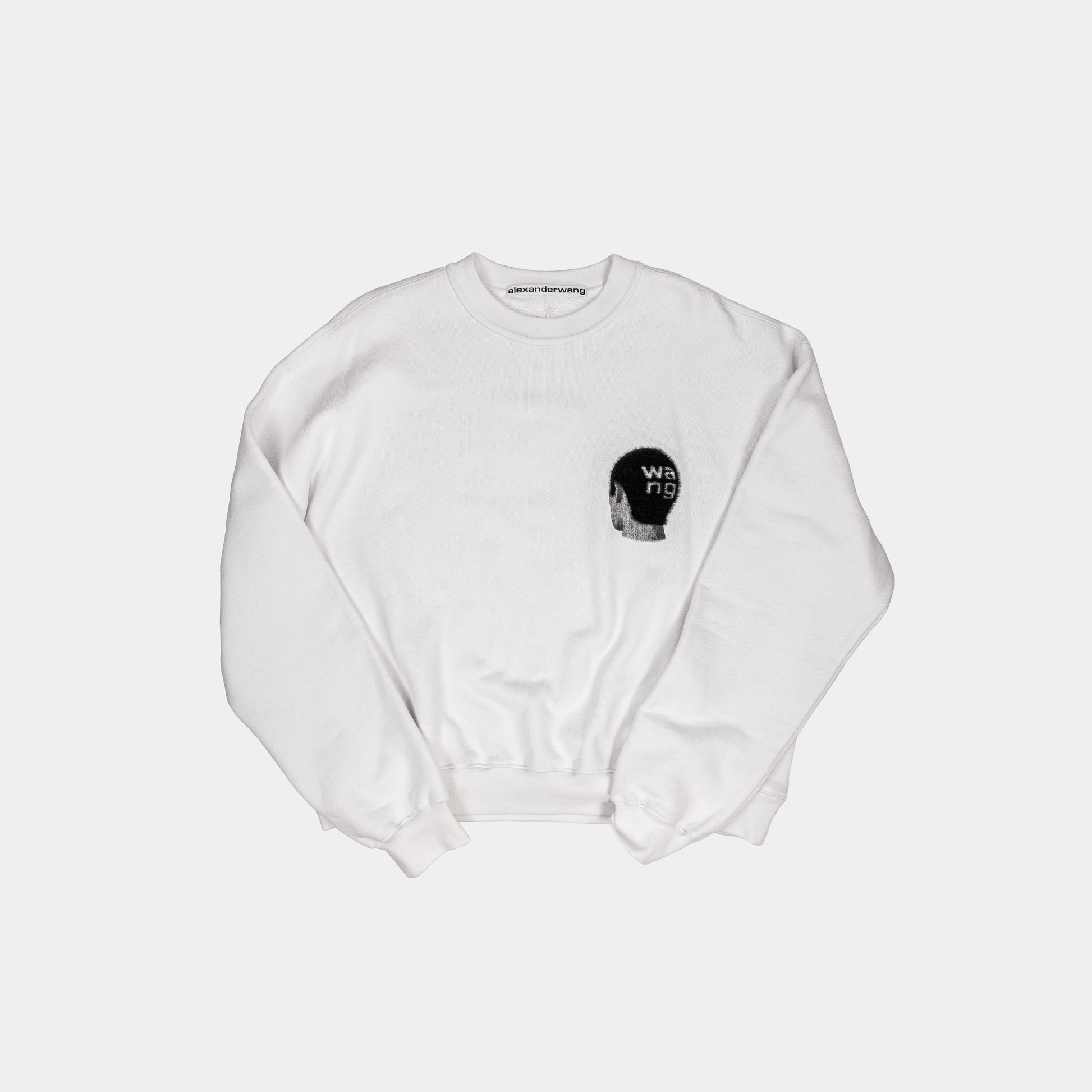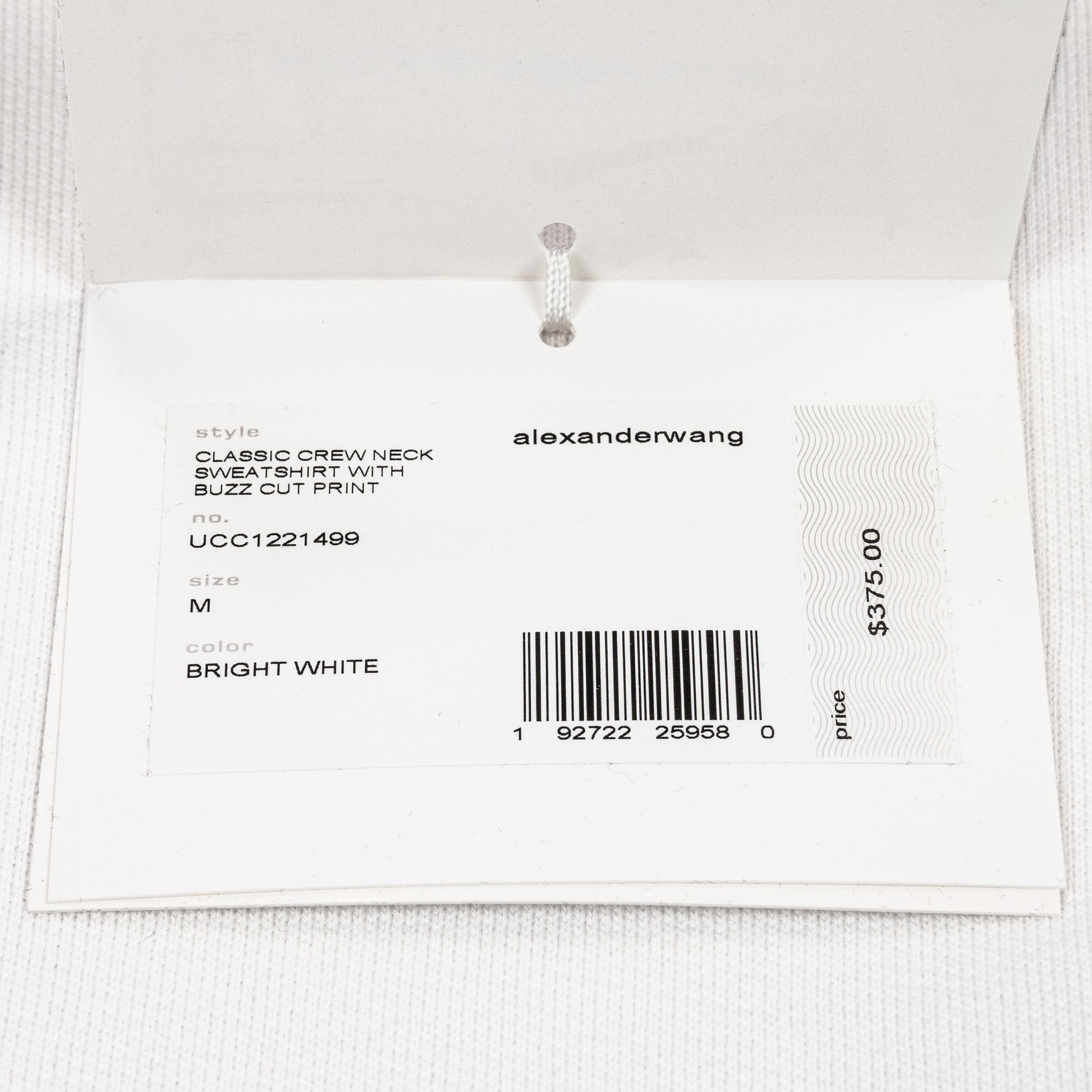 The Alexander Wang Buzz Cut Graphic Pullover in Terry Bright White is a standout piece that fuses streetwear attitude with high-end craftsmanship. This unisex crewneck sweatshirt features a "Buzz Cut" logo graphic, screen printed and electrostatically flocked on the left chest.