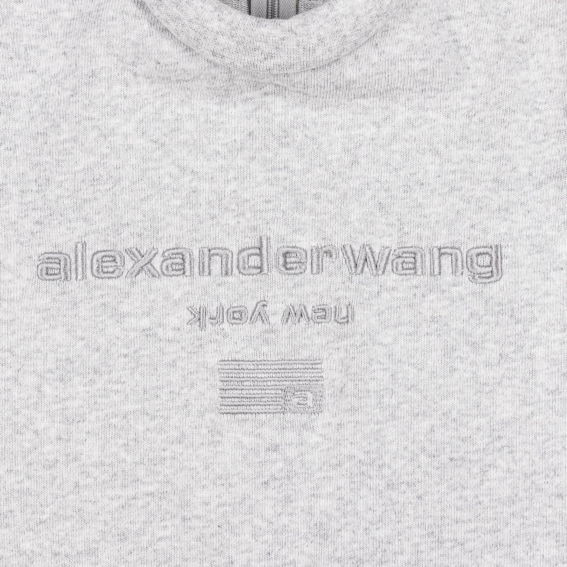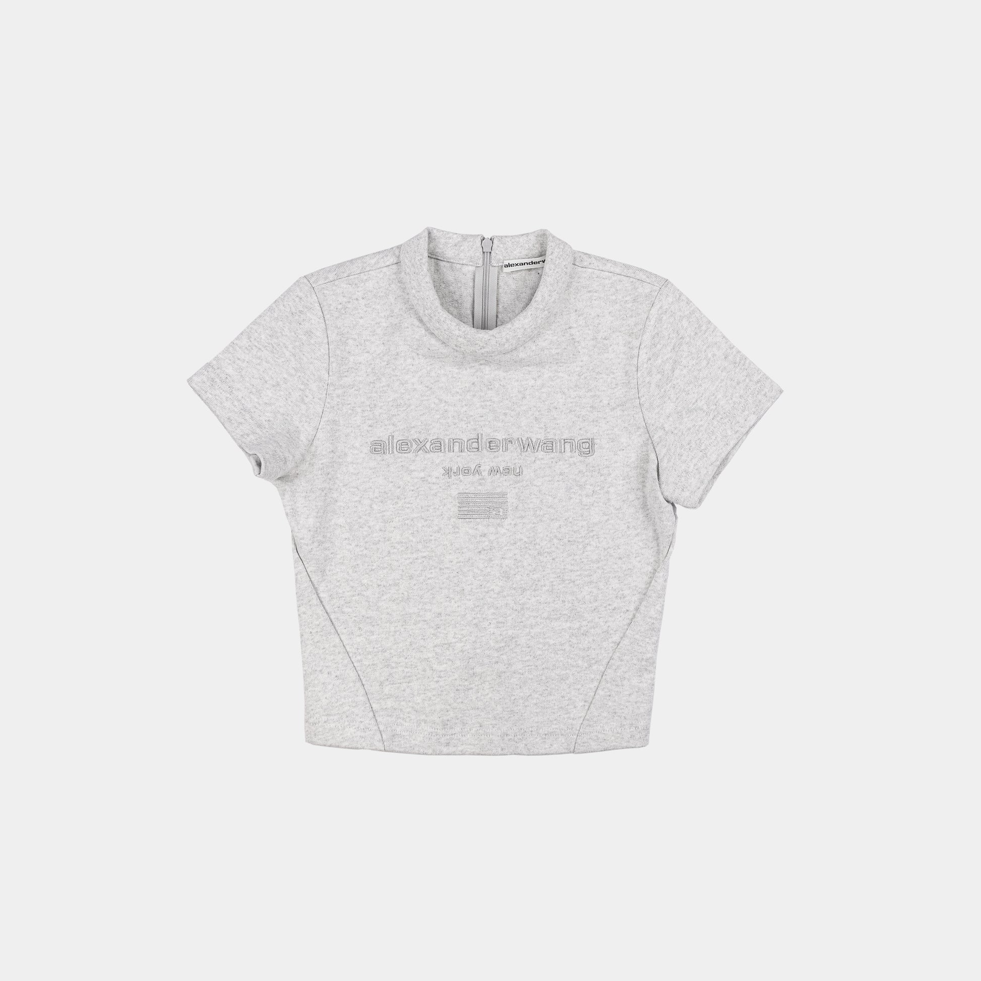 Modern fitted scuba top with padded neckline and tonal 3D embroidered logo at the center front. A chic cropped fit gives it a street-style look. Crewneck Short sleeves Hidden back zip closure construction.