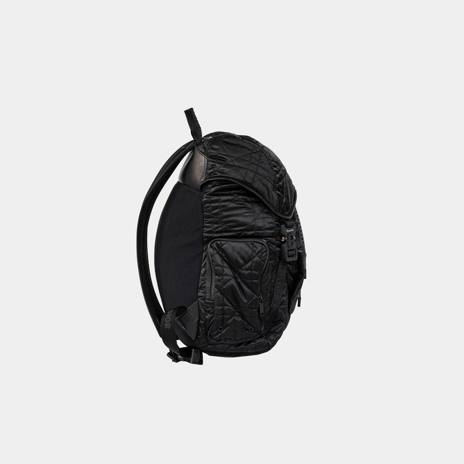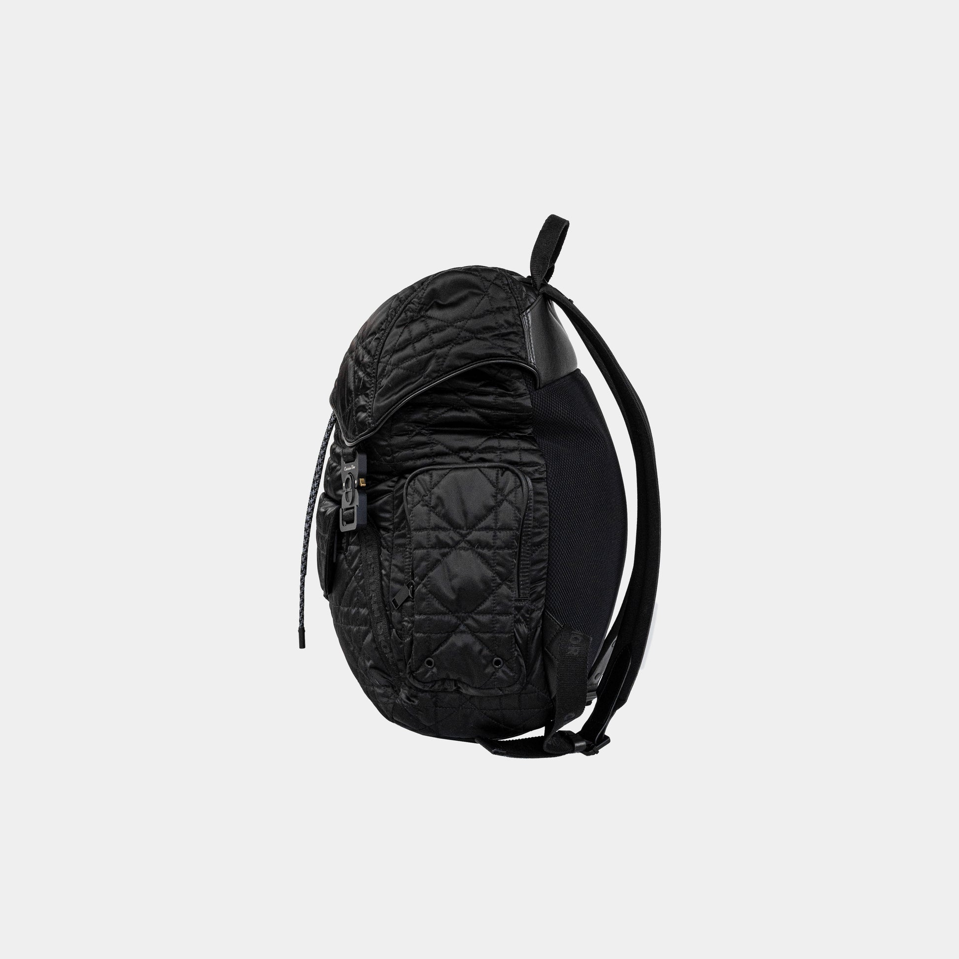 This is an authentic CHRISTIAN DIOR Nylon Cannage Saddle Backpack in Black. The bag features a nylon shoulder strap with embroidered Christian Dior logo and a leather border trim. The facing flap opens to a black nylon interior.