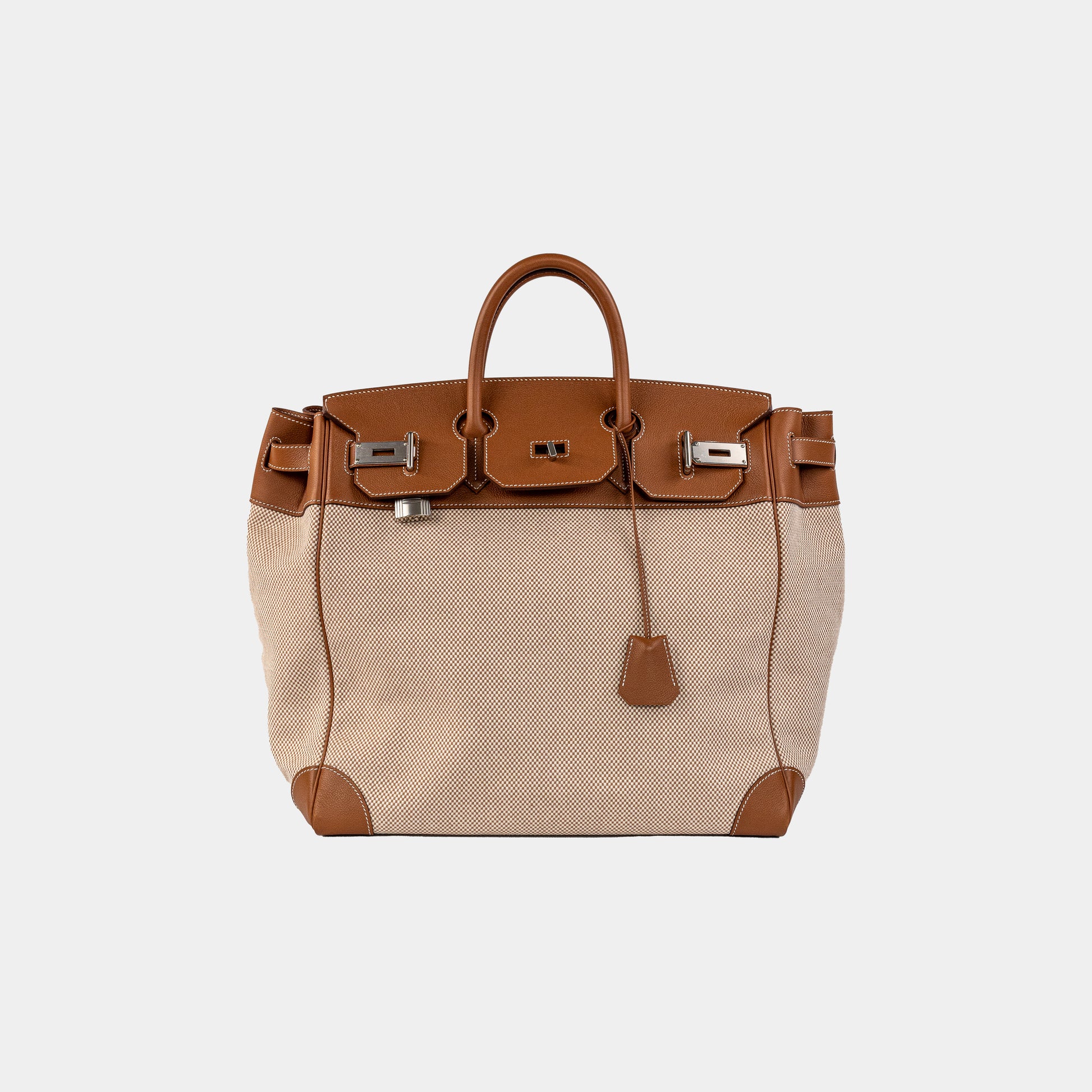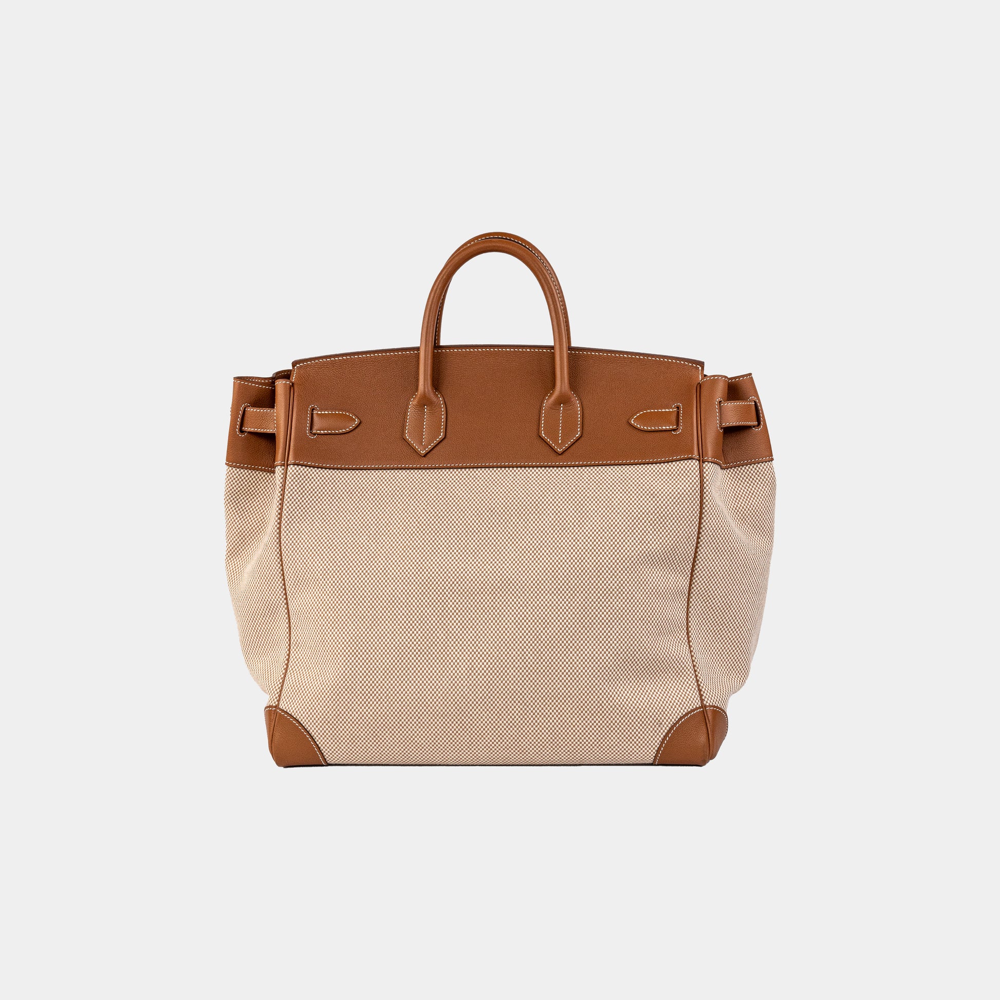 Elevate any wardrobe with this rare Hermès HAC (Haut à Courroies) Birkin 40 in striking Gold Evercolor leather combined with luxurious Ecru Toile de Camp canvas.