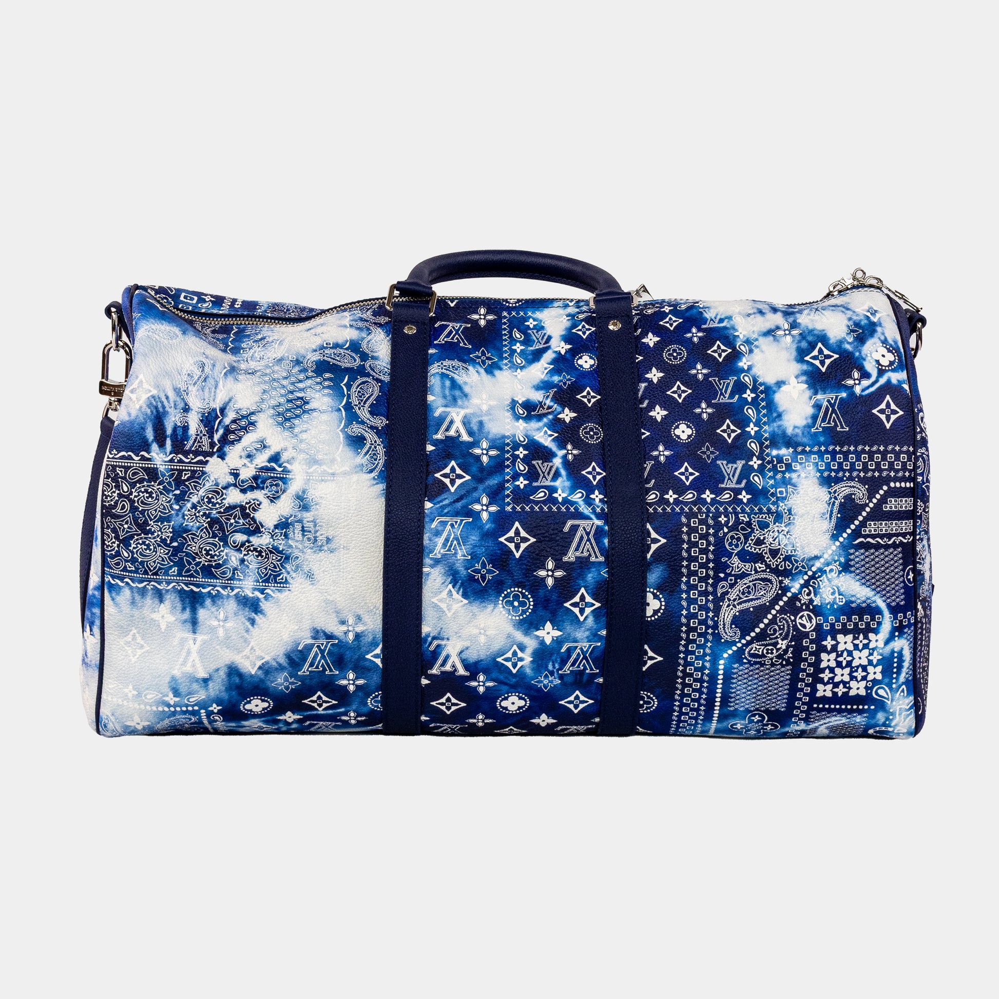 The Louis Vuitton Monogram Bandana Keepall Bandoulière 50 is a limited edition travel bag crafted from iconic Monogram canvas with a bold bandana-style paisley print. It features rolled leather handles, silver-tone hardware, and an adjustable/removable shoulder strap.
