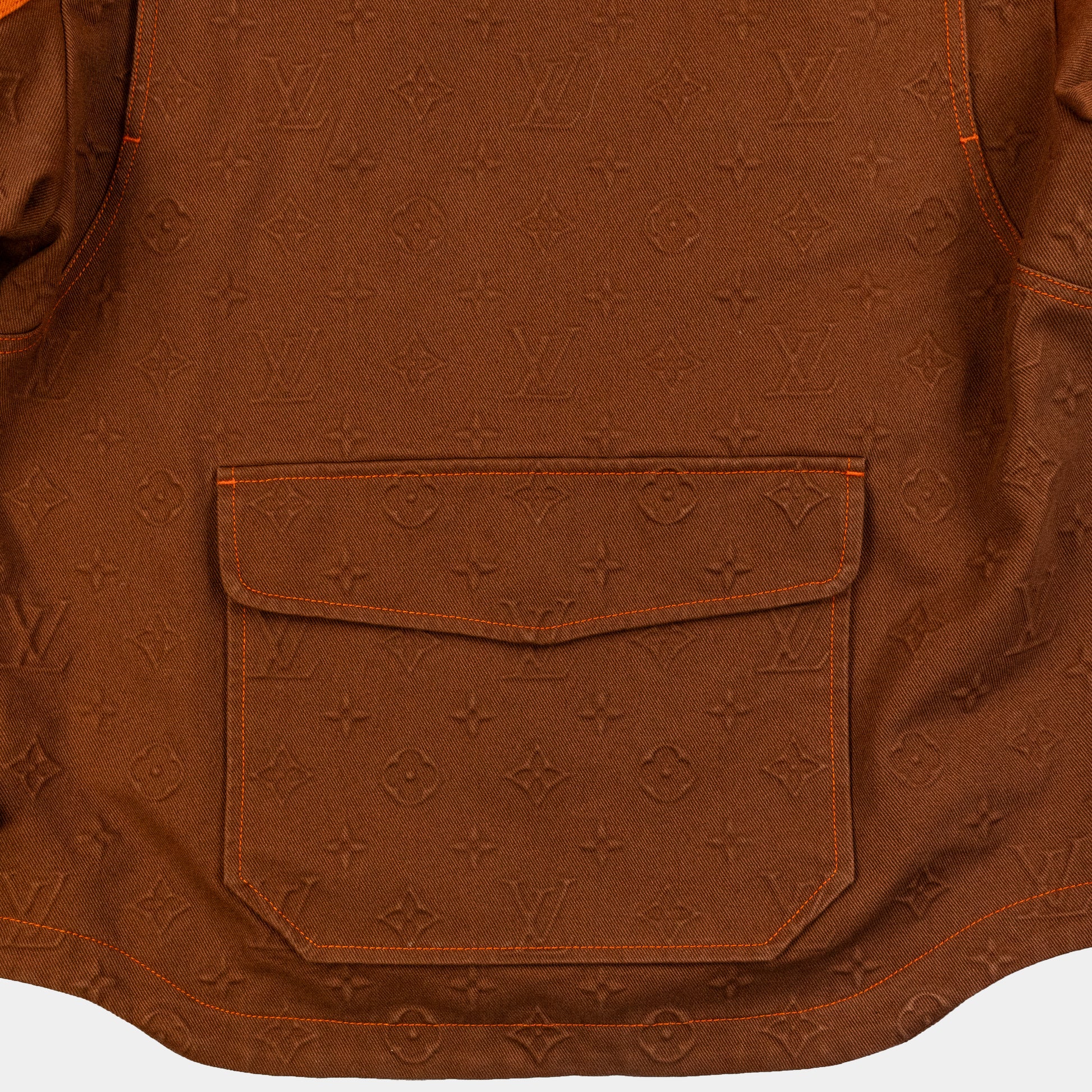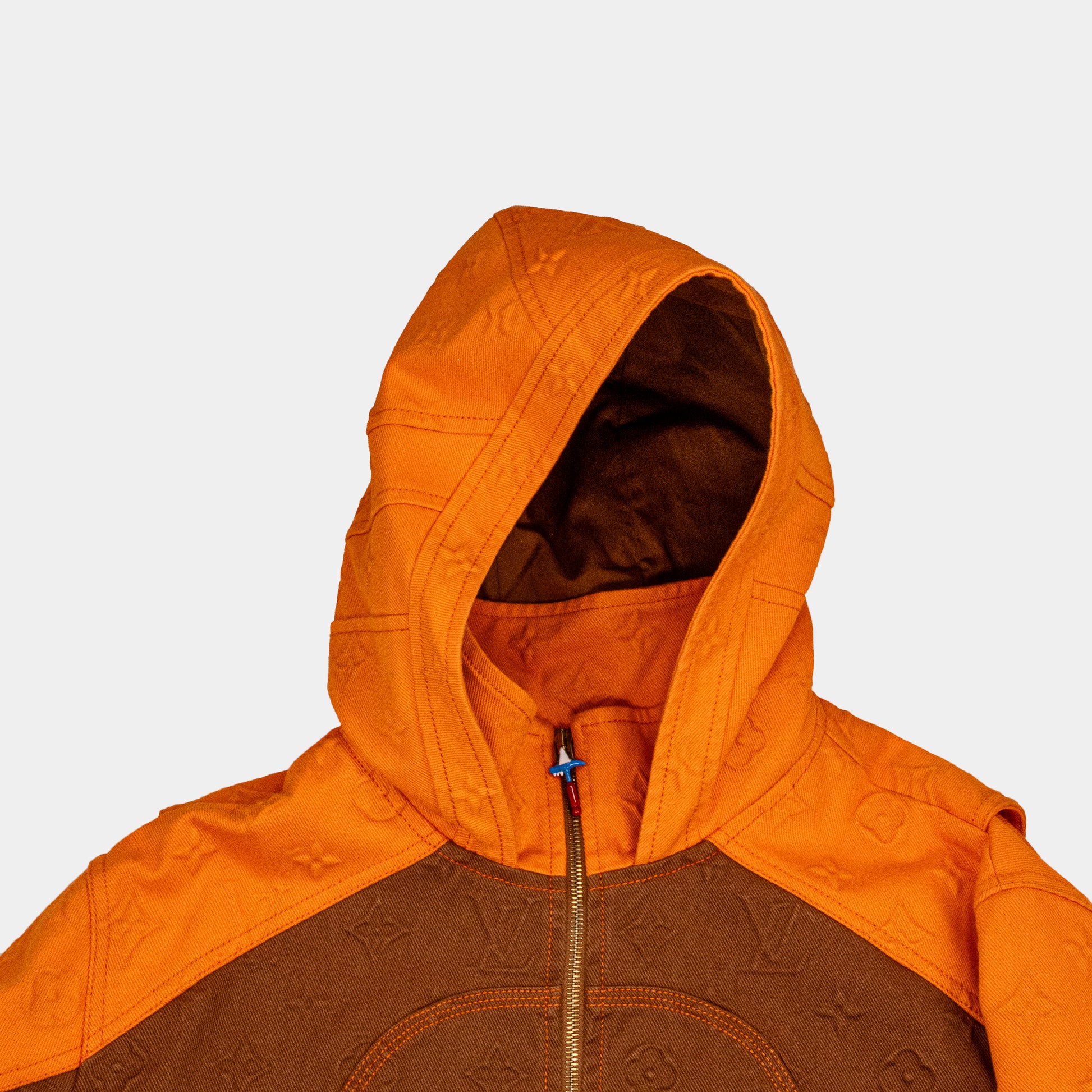This Louis Vuitton Monogram Hooded Denim Jacket blends utilitarian edge with iconic luxury. Crafted from heavyweight denim in a rich orange-brown wash, it features an all-over Monogram jacquard pattern and a relaxed, boxy silhouette. A built-in hood and workwear-inspired pockets complete the look—perfect for layering or statement street style.
