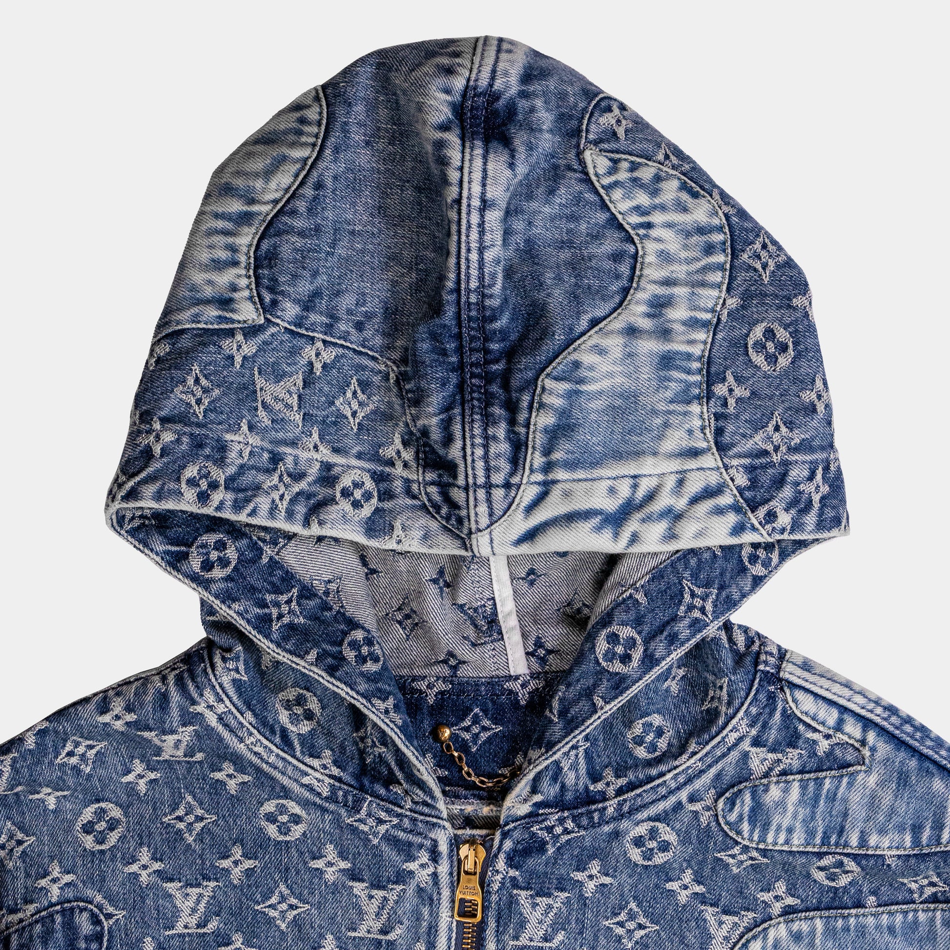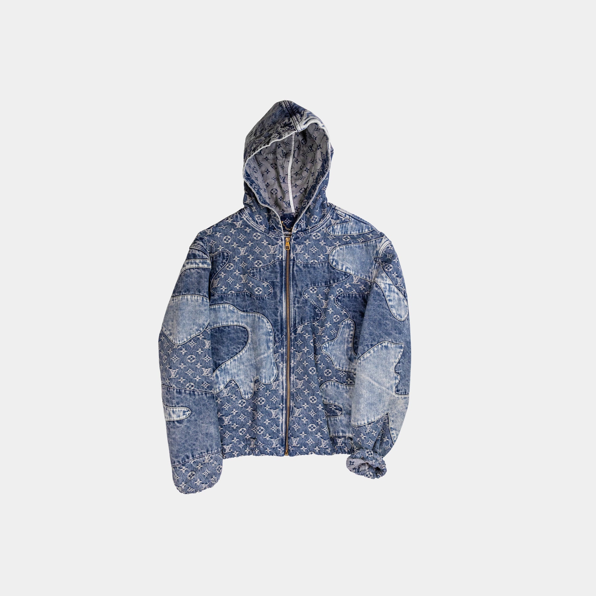 The Louis Vuitton x Nigo Hooded Zip Jacket combines Japanese streetwear aesthetics with luxury craftsmanship in this exclusive collaboration. Made from premium monogram patchwork denim, this jacket features a mix of Louis Vuitton’s iconic monogram and Damier patterns in a contrasting patchwork design. Full-zip closure, adjustable drawstring hood, and ribbed cuffs and hem.