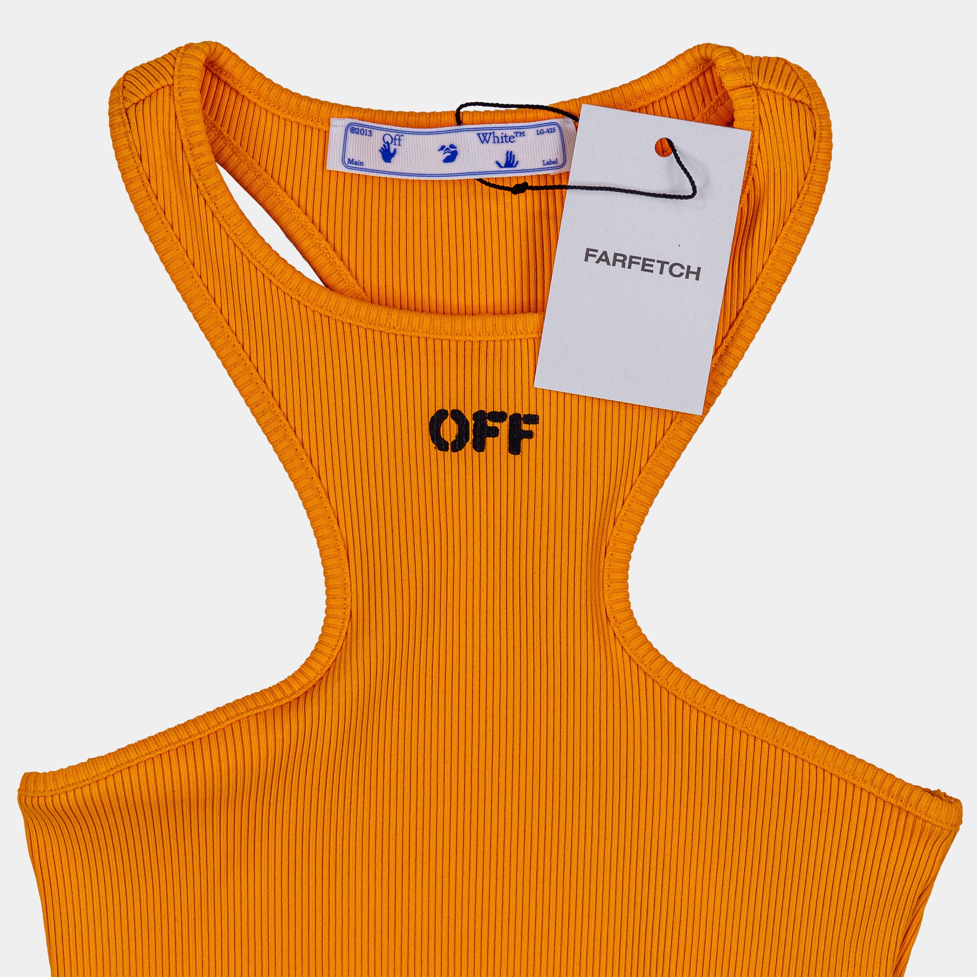 This Off-White Basic Lux Rowing Tank Top in a bold orange hue is the perfect mix of sporty and street-chic. Crafted from a stretchy rib-knit fabric, the top features a crew neckline, racerback, and cropped hem, finished with the signature Off-White logo printed on the chest.