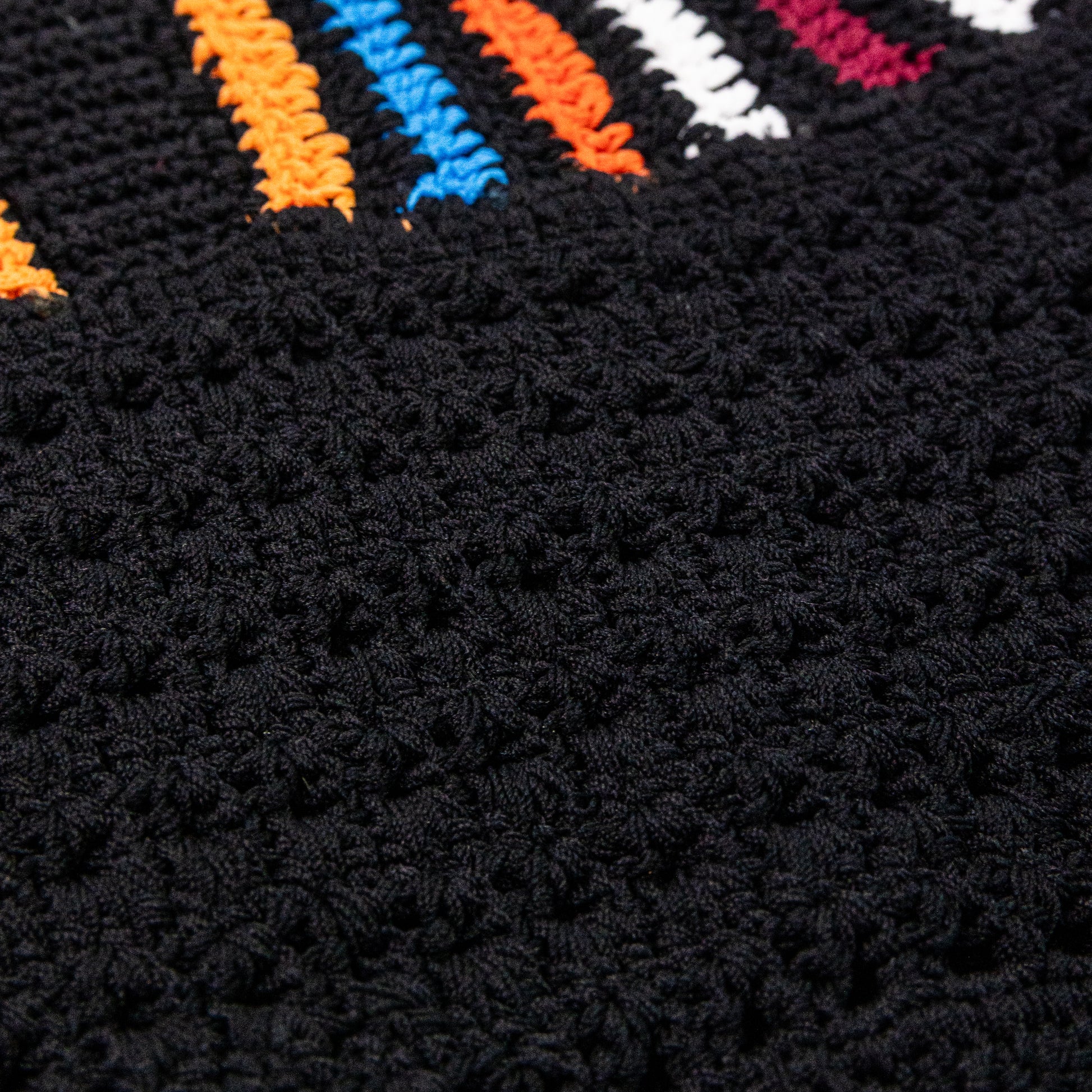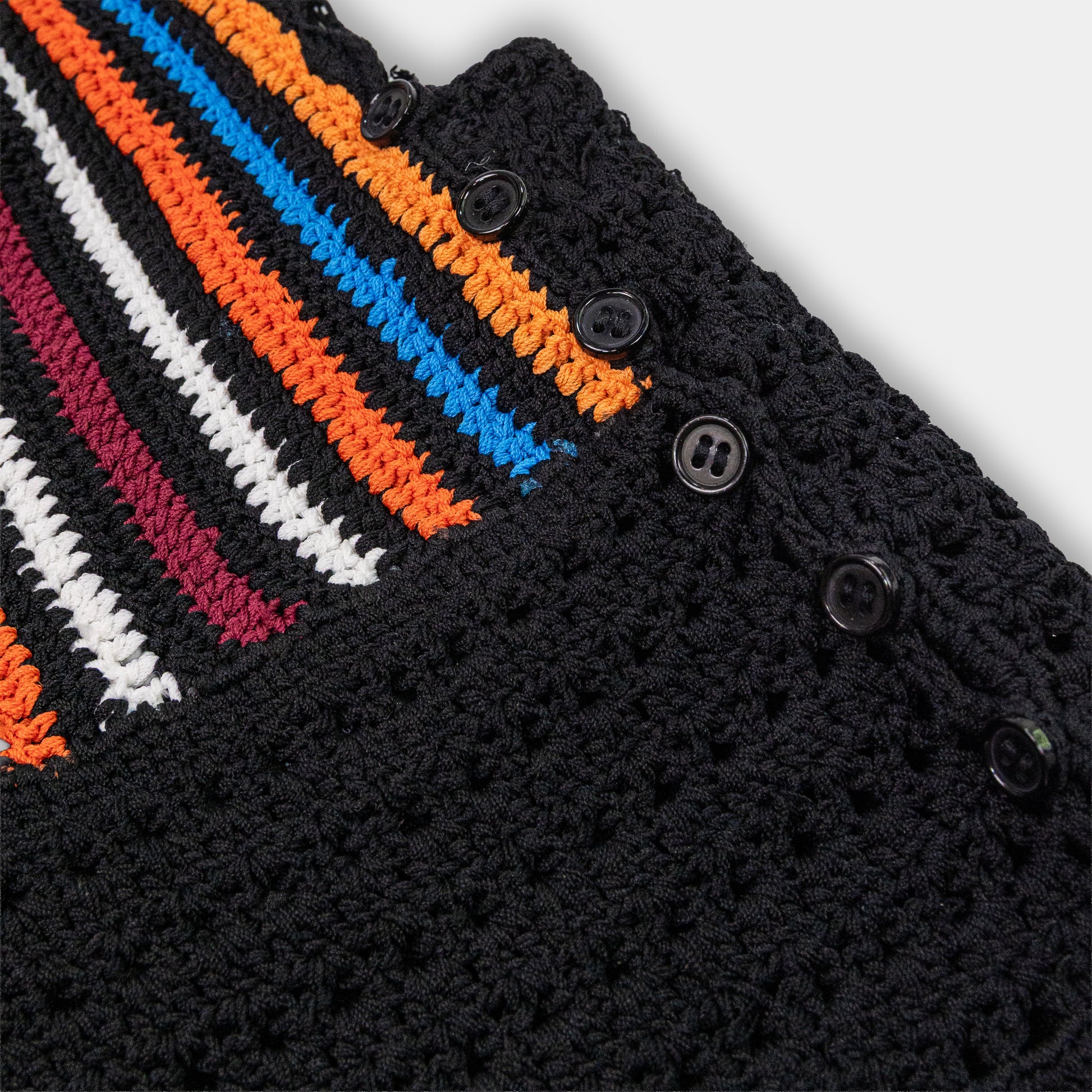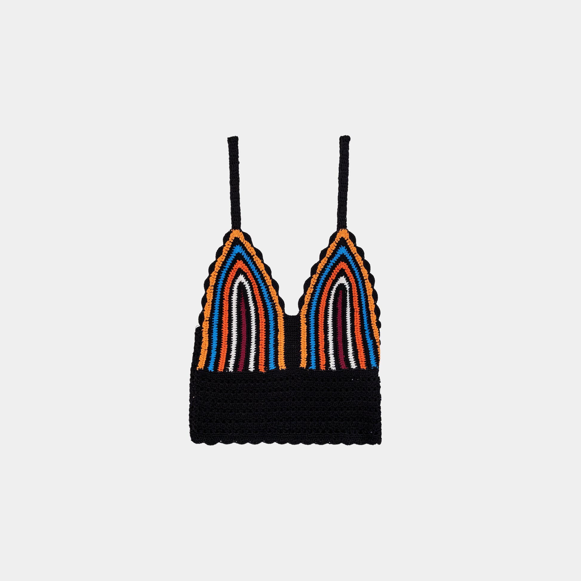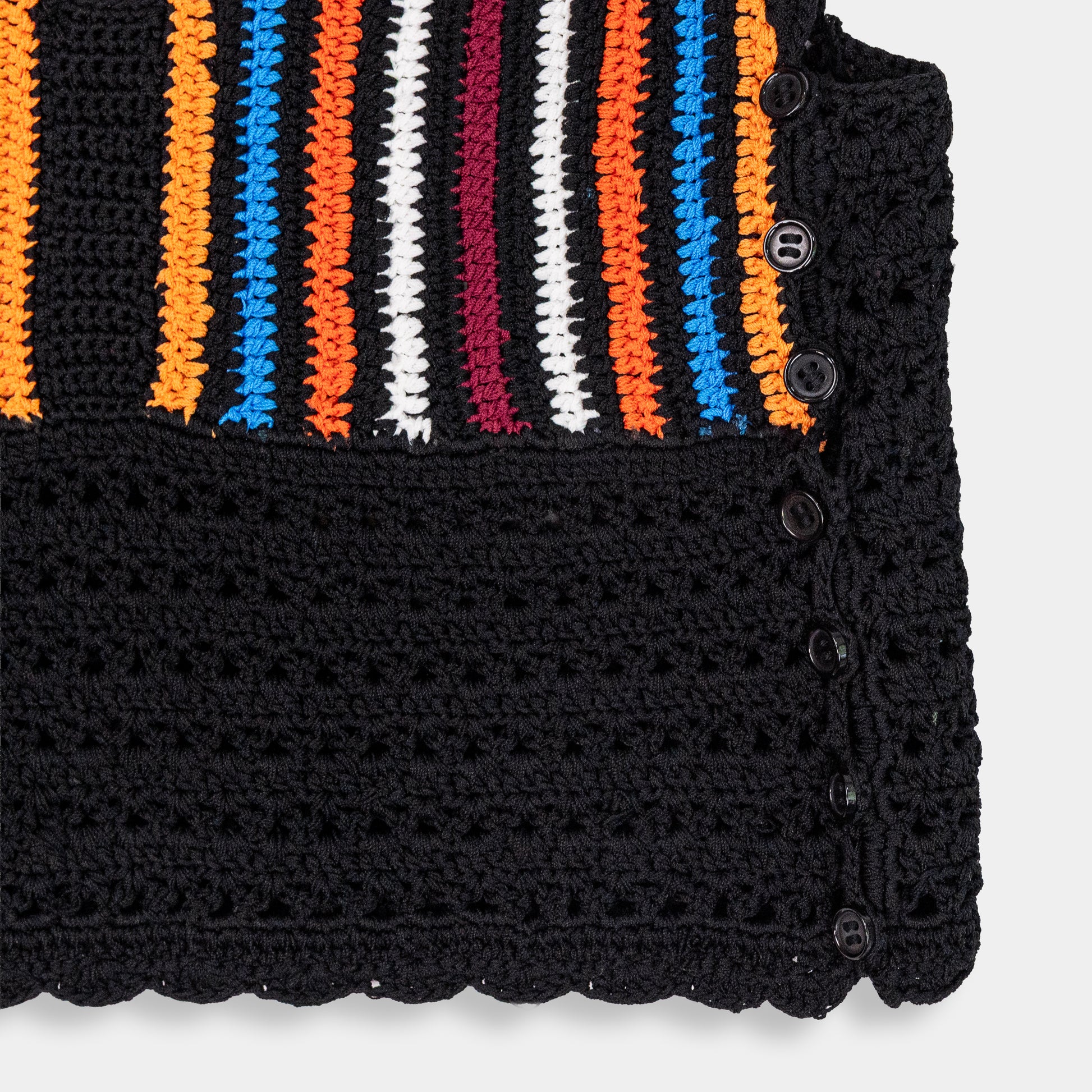 The Sandro “Fenda” top is a sleeveless cropped knit featuring openwork crochet detailing and bold vertical stripes in multicolor hues. Designed with a fitted silhouette and finished with rib-knit trim at the neckline and hem, it blends texture and color for a standout warm-weather piece. Made from a breathable cotton-viscose blend.